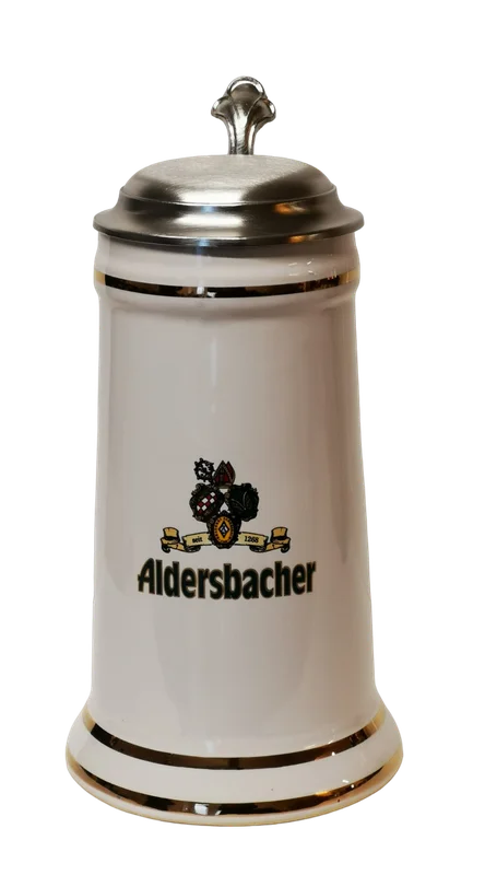 Aldersbacher Keramik Krug „Minister“, mit Zinndeckel und Gravur.